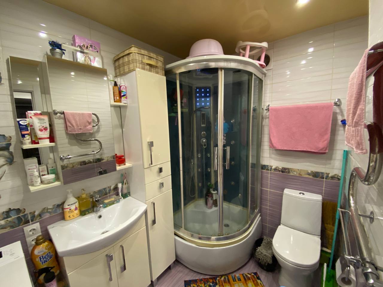 Санузел полностью отделан кафелем, заменена вся сантехника.