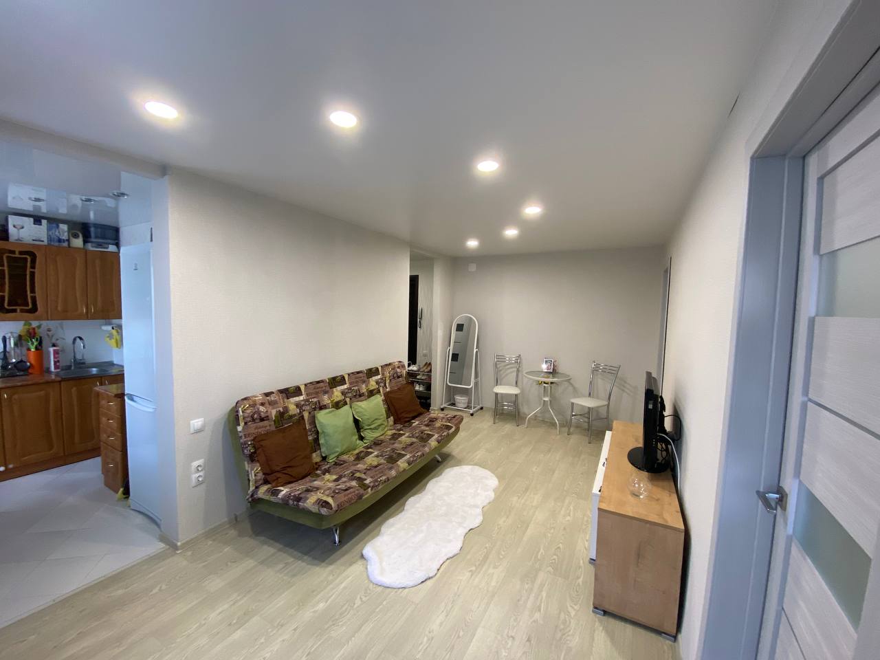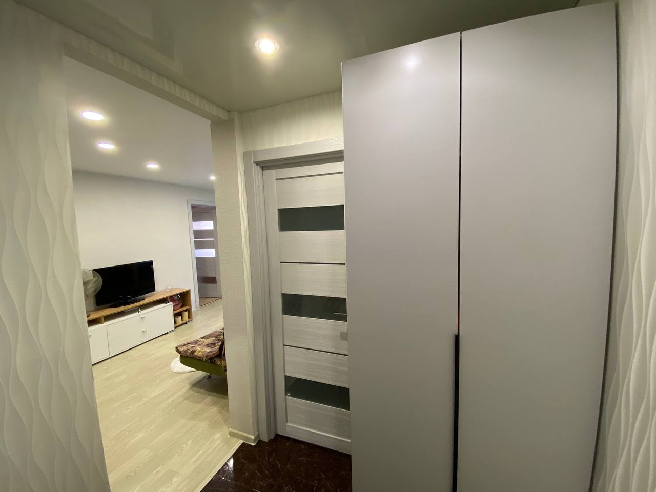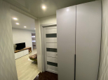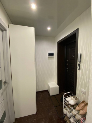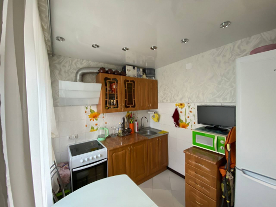 В квартире выполнен качественный ремонт, установлены пластиковые окна, заменена вся проводка, новые радиаторы отопления, пол на кухне и в коридоре выложен кафелем, в зале постелен линолеум, по всей квартире сделаны натяжные потолки.